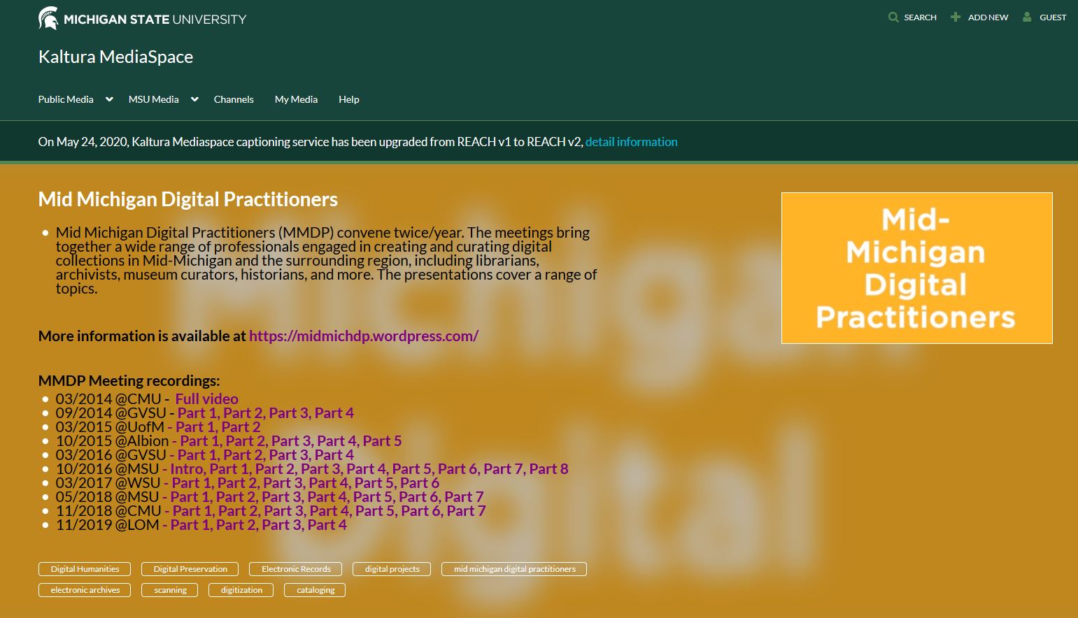 Screen shot of past Mid-Michigan Digital Practitioners meeting recordings on the MSU Kaltura website