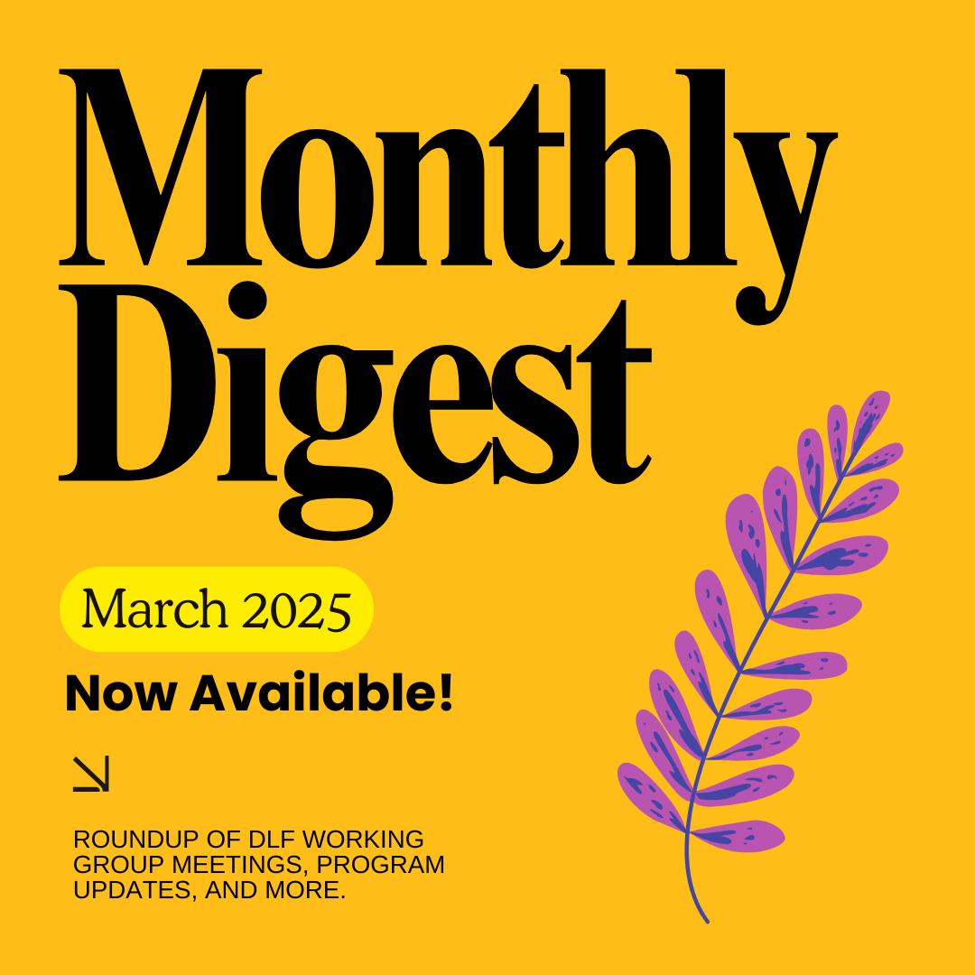 A monthly round-up of news, upcoming working group meetings and events, and CLIR program updates from the Digital Library Federation. See all past Digests here.
