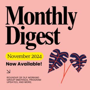 A monthly round-up of news, upcoming working group meetings and events, and CLIR program updates from the Digital Library Federation. See all past Digests here.